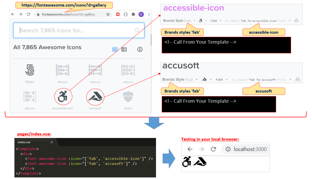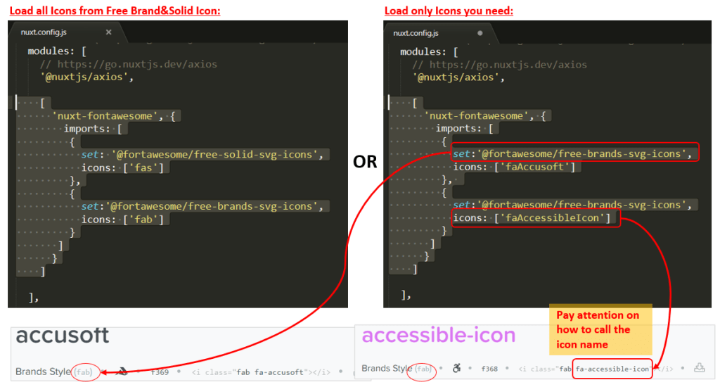Let’s say we want to load Free icon from Brand: fa-accusoft and fa-accessible-icon, so we need to set nuxt.config.js module as below: