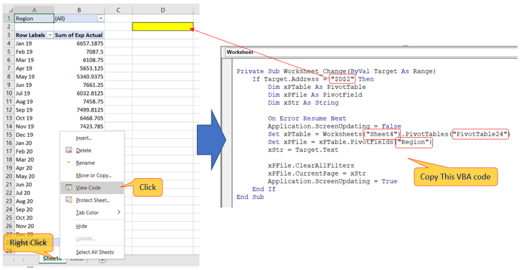 Next step, right-click the pivot table sheet name à View Code, as below: