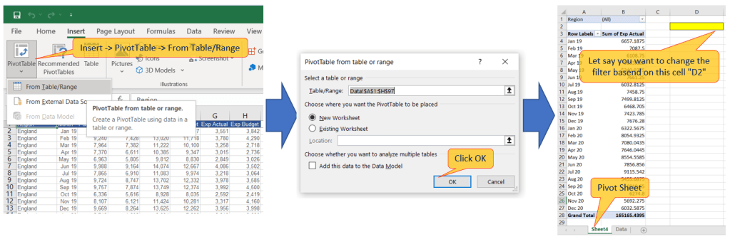 From excel data above create a pivot table “Insert -> PivotTable -> From Table/Range”: