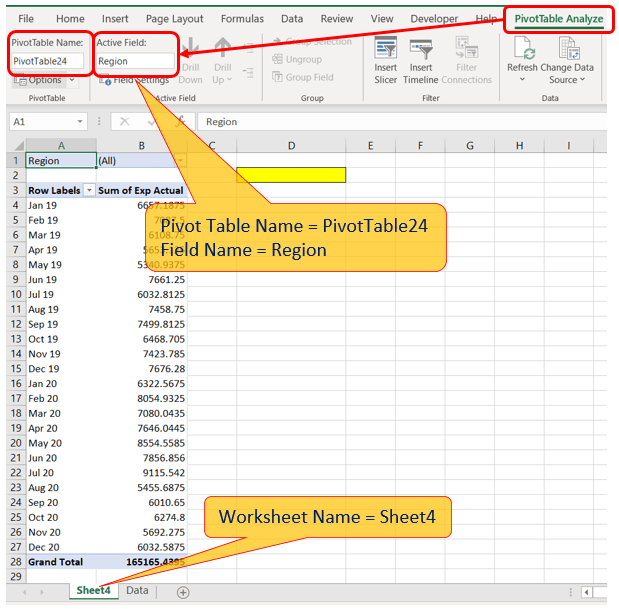 From picture above find worksheet, PivotTable and Active Field name. First go to “PivotTable Analyze à PivotTable | Active Field” and you’ll find all names you need: