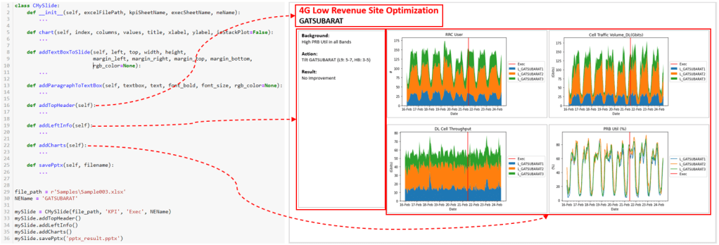 - __init__(self, excelFilePath, kpiSheetName, execSheetName, neName): the input to this function are excel-file, 2 sheet (KPI & Exec), and neName to filter the data frame. On this function, data will load from 2 sheet (KPI & Exec) and filter the data based on neName. Not least, create PowerPoint presentation and add a slide.