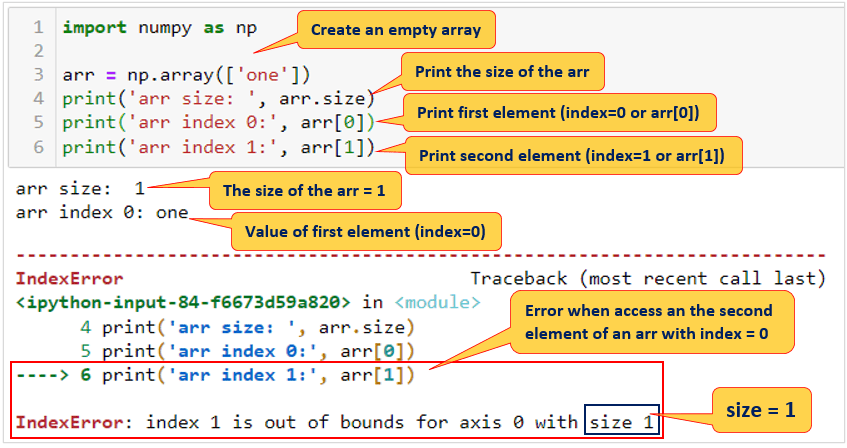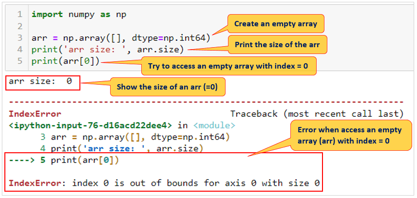 Let’s try to create an empty numpy.array and try to access it with a zero (0) index: