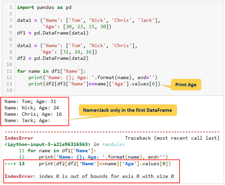 Let’s make 2 Pandas DataFrame, when both of DataFrame will have 2 columns (Name and Age), and on this example Name of first DataFrame will be looped and if the Name in the second DataFrame then Age from second DataFrame will be printed.