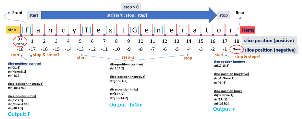 At this point, you should already know the concepts of index-position (both for positive and negative), slice-position (both for positive and negative), and step parameter will influence your slice-position (both for positive and negative).