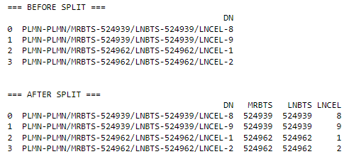 df[['PLMN', 'MRBTS', 'LNBTS', 'LNCEL']] = df['DN'].str.split('/', 3, expand = True)