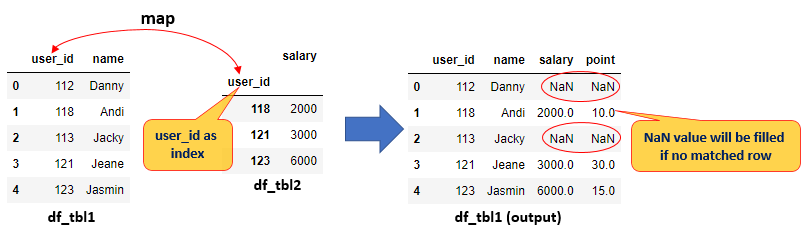 - Or you can map from the selected column in the first table (df_tbl1 dataframe) to key/index in the second table (df_tbl2 dataframe)