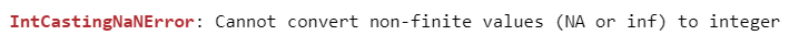 - Cannot convert non-finite values (NA or inf) to integer: This is the description of the error. It tells you that there’s an attempt to convert values that are either NA (similar to NaN) or infinity to an integer, which is not allowed.