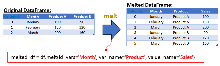 In the melted DataFrame, we have three columns: ‘Month’, ‘Product’, and ‘Sales’. The id_vars parameter in the melt function is used to specify the column(s) that you want to keep unchanged (in this case, ‘Month’). The var_name parameter is used to name the new column that will contain what were previously column headers (‘Product A’ and ‘Product B’), and value_name is used to name the new column that will contain the corresponding values (‘Sales’).