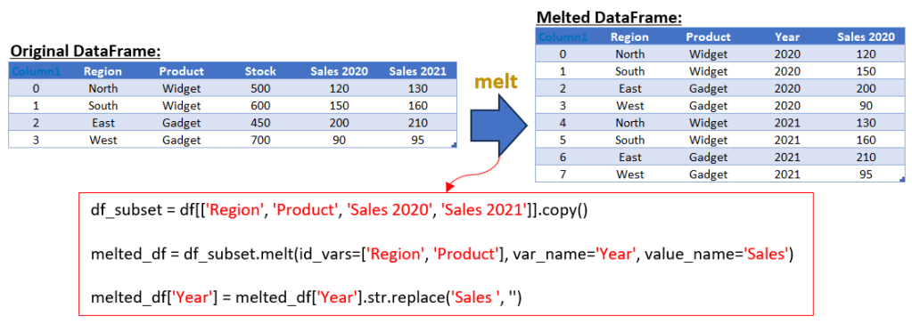 - Creating a Subset DataFrame: Before melting, a new DataFrame df_subset is created, which includes all columns from df except for the “Stock” column. This is done by selecting only the ‘Region’, ‘Product’, ‘Sales 2020’, and ‘Sales 2021’ columns.